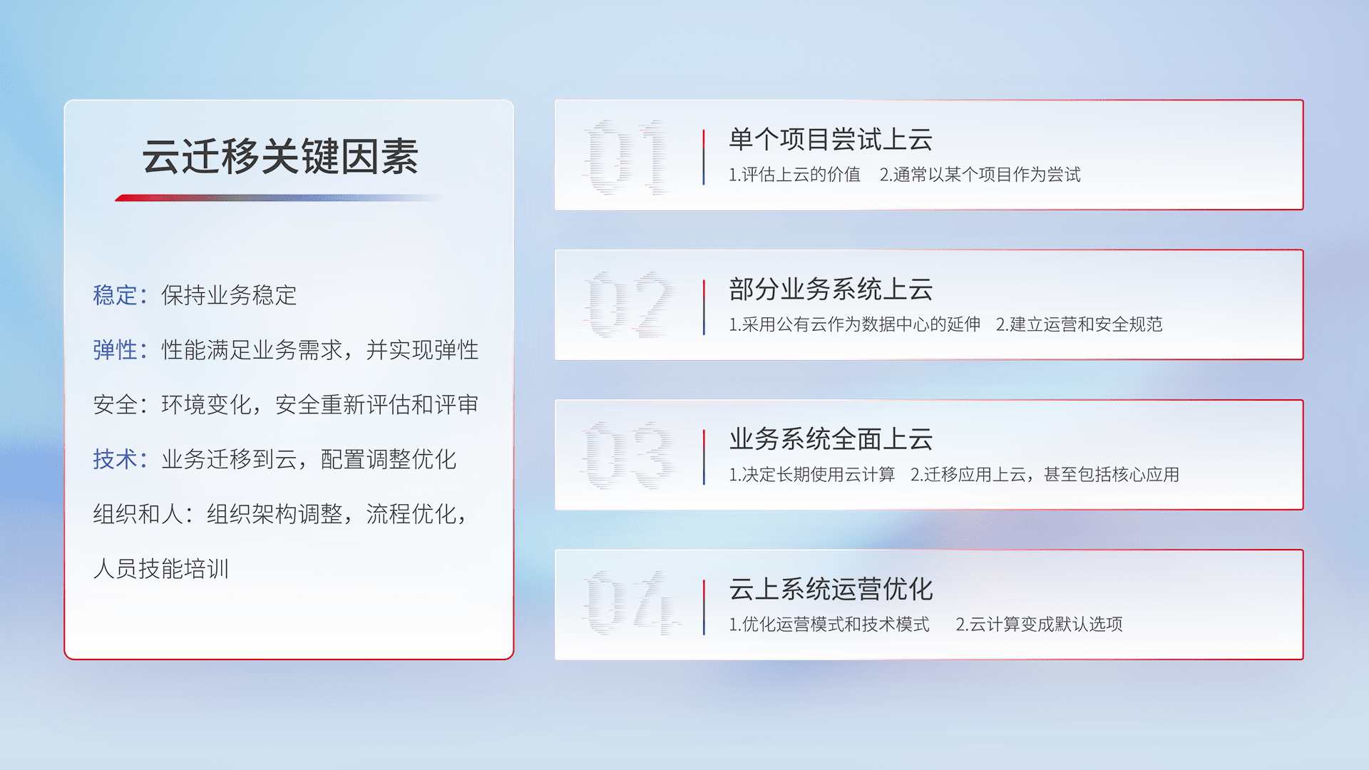 结合实际业务,,,从规划设计、、云平台选型、、云原生改造、、、、数据迁移、、集成交付,,,,迁移全过程为客户识别最佳上云路径,,,做好风险识别管理,,,,设计网络架构、、、身份权限、、、安全审计合规、、操作审计、、、日志审计、、、监控告警策略、、、、多站点容灾设计等,,,对云上基础设施进行整体规划,,,,提升IT治理水平,,,以满足弹性、、、高可用、、高性能的需求。。。