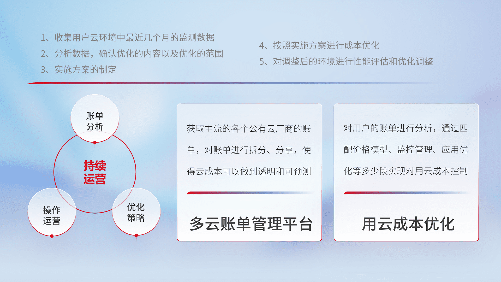 通过多云纳管,,以统一的资源数据模型把客户的云资源进行抽象和封装,,,进而实现对多云资源的统一操作,,保障云资源管理的可靠性、、、稳定性与可用性。。。。量身定制化运维内容,,,,配置、、开发运维、、、、补丁管理、、、备份、、、监控、、认证和访问管理、、审计和日常巡检等,,,,保障在用云过程中的可靠度,,稳定度以及高可用率。。